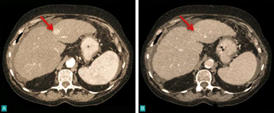 La Revue du Praticien - Jean-Frédéric Blanc Scanner. Avec hypervascularisation intense au temps artériel (A) et lavage (wash-out) au temps portal tardif (B).CHC sur foie de cirrhose.