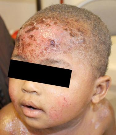 Impétiginisation de lésions de dermatite atopique au niveau du front avec présence de lésions vésiculo-bulleuses, croûtes mélicériques, placard inflammatoire ou fièvre signe d'une surinfection à staphylocoque doré.