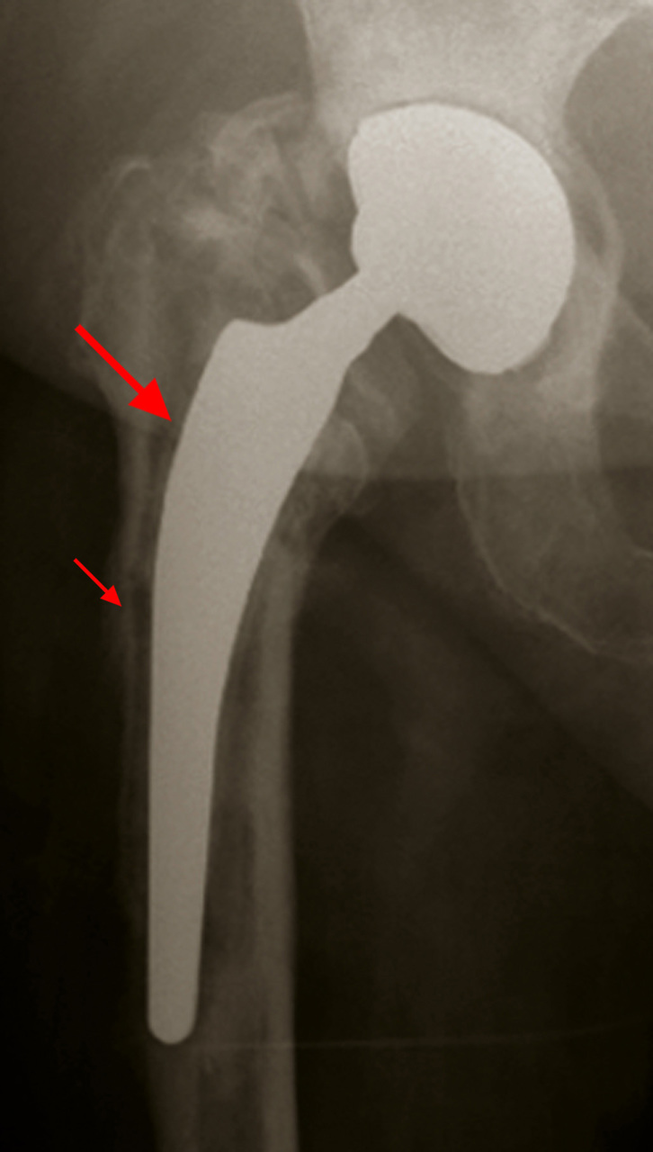 Grande flèche : liseré d'ostéolyse avec descellement de la hampe fémorale.Petite flèche : appositions périostées.