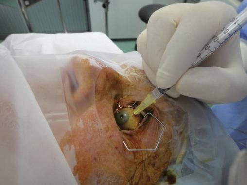 © Jean-François Korobelnik, La Revue du Praticien Injection intravitréenne de ranibizumab, avec une aiguille 30G, sous anesthésie topique.