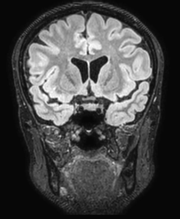 Il s’agit d’une séquence en T2 car la coupe est anti-anatomique : la substance blanche est ici grise et la substance grise est blanche. En temps normal, le liquide cérébro-spinal est blanc (en hypersignal dans les coupes en T2) ; ici, son signal a été supprimé, c’est donc un T2 FLAIR (pour fluid attenuated inversion recovery).
