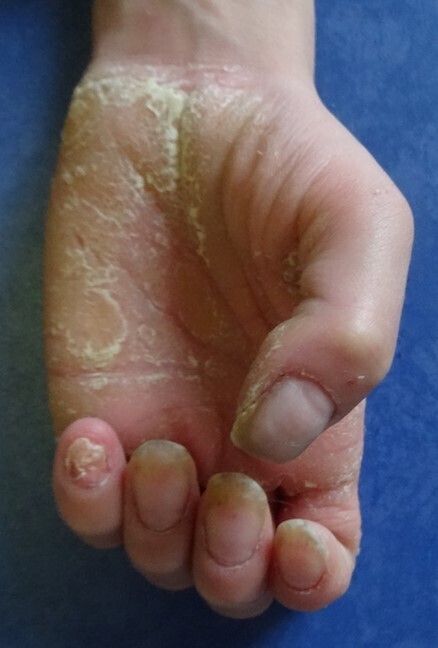 Épaississement de la peau des paumes des mains qui retentit sur la motricité fine (écriture). Extrait de : Quand suspecter une génodermatose ?