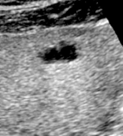 Echographie. Image anéchogène avec un renforcement postérieur.