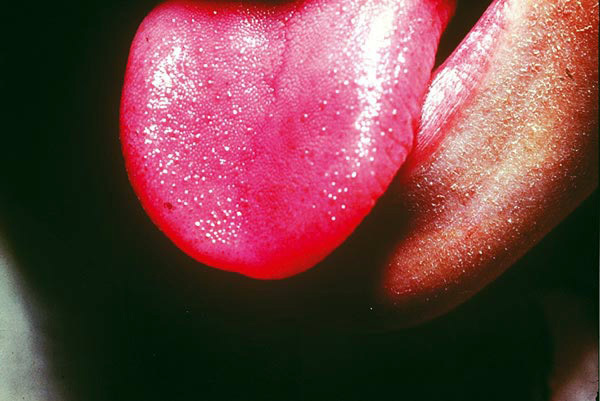 L’exanthème de la scarlatine s’accompagne d’un énanthème, avec une langue d’abord saburrale puis devenant rouge framboisée au 5e jour, de grande valeur diagnostique dans les formes atténuées.