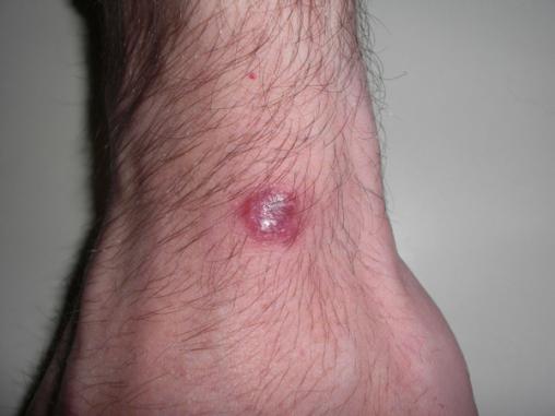 Leishmaniose cutanée localisée sous la forme d'un nodule unique du poignet à Leishmania infantum au retour d'Espagne.