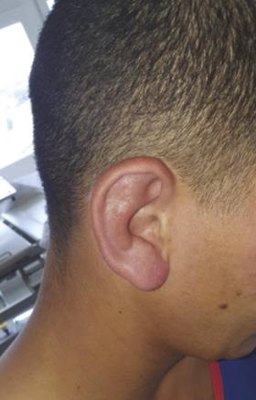 Lésions maculo-papuleuses avec infiltrat diffus au niveau des oreilles symptôme d'une lèpre.