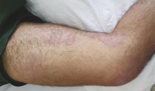 Lésions maculo-papuleuses prurigineuses au niveau des membres inférieurs révélant une lèpre.