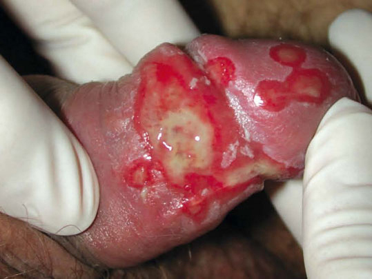Syphilides érosives. L’absence de douleurs malgré le caractère érosif des lésions est évocateur d’une syphilis. Le cytodiagnostic d’herpès est négatif. Par contre, l’examen au miscroscope à fond noir montre de nombreux spirochètes. Le diagnostic est celui de syphilides érosives dans le cadre d’une syphilis secondaire. Ces lésions sont hautement contagieuses. L’évolution est favorable sous une injection d’Extencilline. La recherche systématique d’une autre infection sexuellement transmissible a permis, chez ce patient, de révéler la présence de gonocoques dans l’oropharynx (coll. N. Dupin).