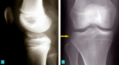 A. Profil : avulsion du massif des épines tibiales.B. Face : fracture de Segond.