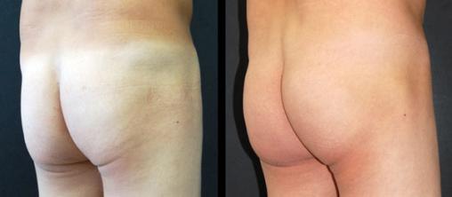 Correction d’une lipoatrophie des fesses chez un homme de 37 ans par injection de gel d’acide hyaluroniqueMacrolane. (À gauche) Vue préopératoire. (À droite) Vue postopératoire à 2 mois. Voir : Claude O, Chirurgie des lipodystrophies, Rev Prat 2010;9:1235-40.