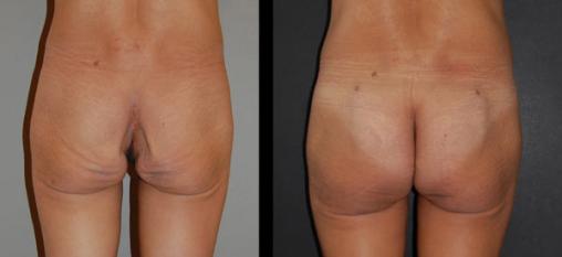 Correction d’une lipoatrophie des fesses d’une femme de 46 ans par injection de gel d’acide hyaluronique Macrolane.