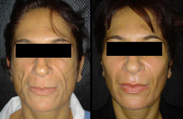 Correction d’une lipoatrophie faciale grade III par implants sous-malaires de Medpor. (À gauche) Vue préopératoire. (À droite) Vue postopératoire à 12 mois. Voir : Claude O, Chirurgie des lipodystrophies, Rev Prat 2010;9:1235-40.
