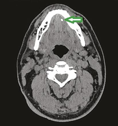 Scanner montrant un calcul du tiers antérieur du canal de Wharton gauche. Extrait de : Pathologies lithiasiques des glandes salivaires