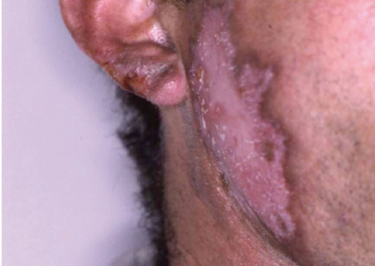 Lupus discoïde avec atrophie cicatricielle.