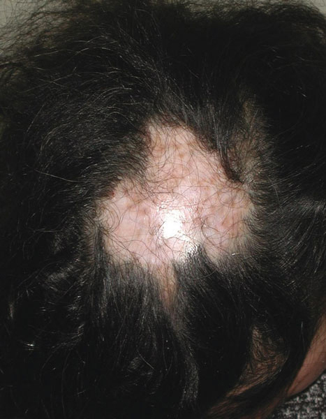 Dans le cadre d’un lupus érythémateux, la pseudo-pelade est habituellement érythémateuse, squameuse et discrètement atrophique, et il existe en histologie un infiltrat péripilaire et uneatteinte du cuir chevelu en zone interfolliculaire, tandis que l’immunofluorescence peut montrer une bande lupique.