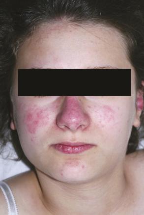 Atteinte cutanée typique d'un lupus aigu localisé constitué de placards érythémateux, plus ou moins œdémateux ou squameux, voire papuleux, situés majoritairement sur les joues et le nez.