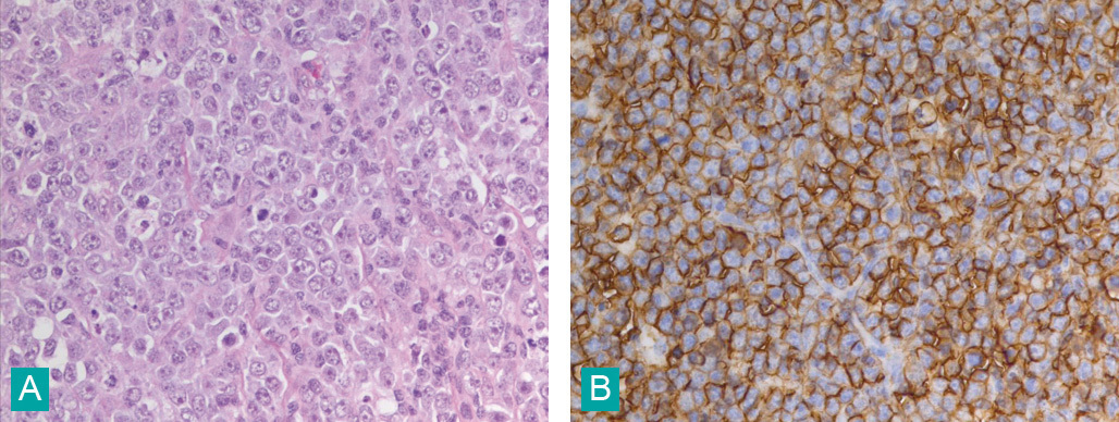 © Julie Bruneau, Nicole Brousse (La Revue du Praticien) Les grandes cellules tumorales (A) expriment le CD20 (B).