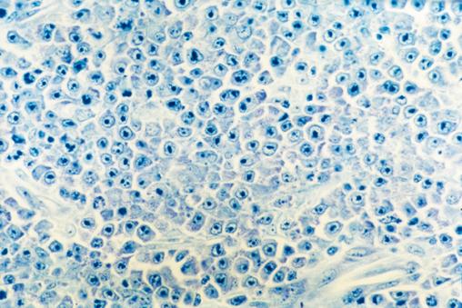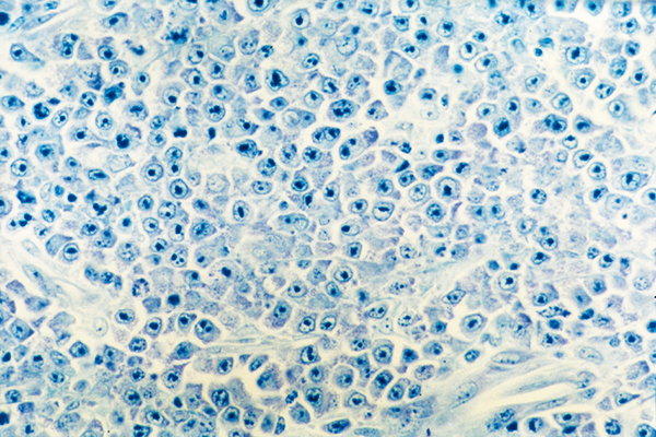 Biopsie ganglionnaire. Nappe homogène de grandes cellules à noyaux nucléolés infiltrant l'ensemble du ganglion (coloration par Giemsa).