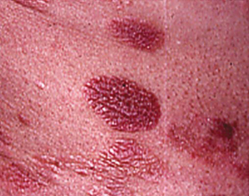 Plaques érythémateuses infiltrées. Dans sa forme typique, dite progressive, le mycosis fongoïde suit une évolution chronique. Il s’agit d’un lymphome cutané T indolent. Le plus fréquent des lymphomes T cutanés (43 % de l’ensemble des lymphomes cutanés).