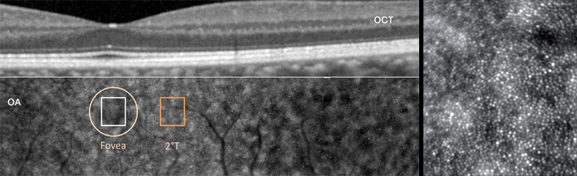 Image en optique adaptative (OA) passant par le centre de la macula et correspondant à la coupe en tomographie en cohérence optique (OCT).À droite, l’agrandissement d’une zone située à 2° en temporal du centre de la fovéa montre la mosaïque normale des photorécepteurs (précisionde 2 μm). Clichés dus à l’obligeance du Pr Michel Paques.