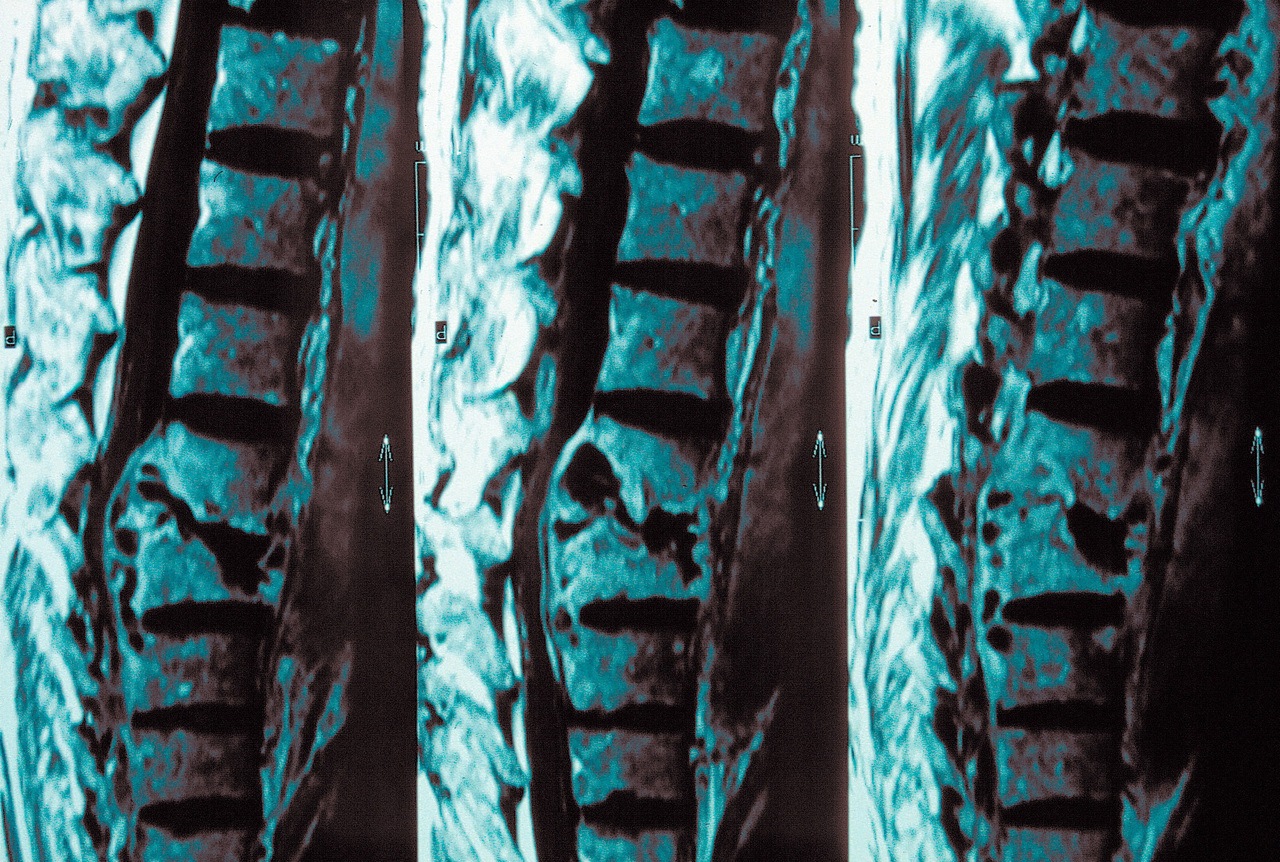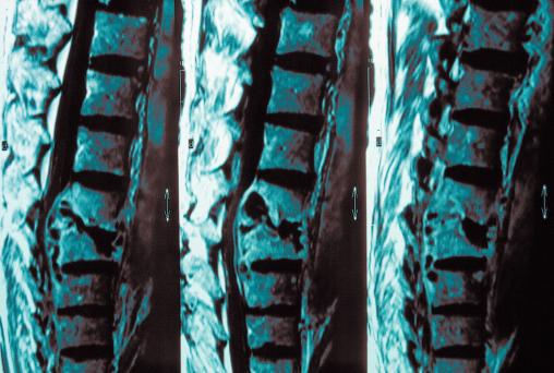 Mal de Pott (D11-D12) visible sur une IRM rachidienne (T1).