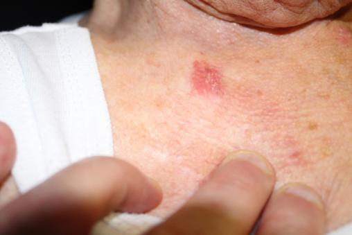 Collection P. Frances Lésion érythémateuse apparue à la base du cou avec une macule rose avec des squames au centre. Extrait de : Rouge danger…