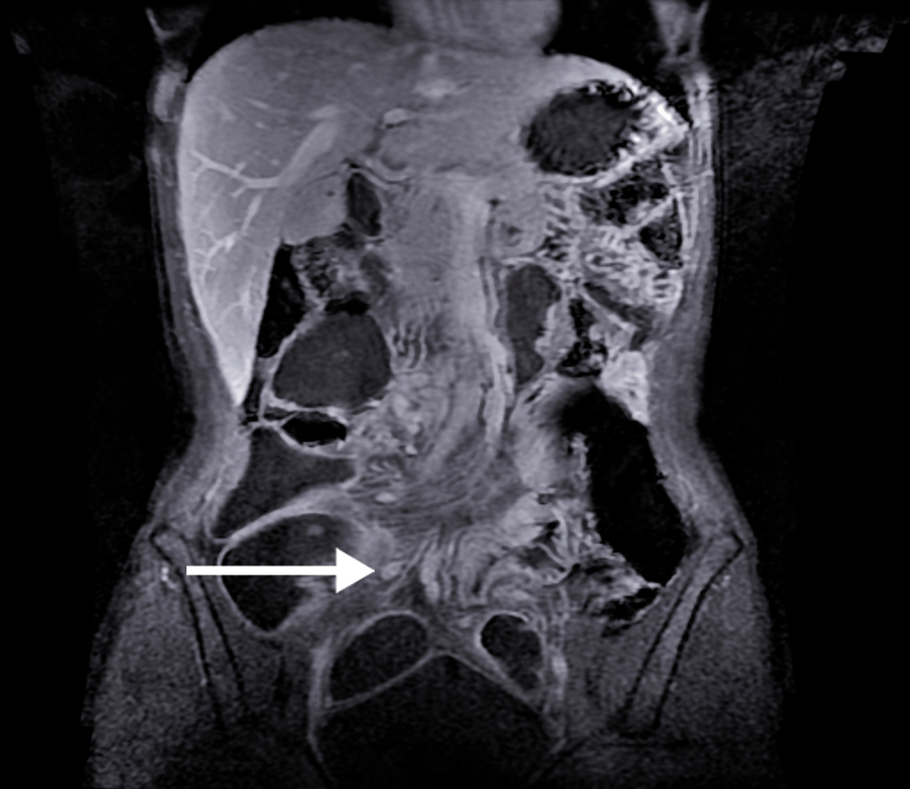 IRM. Adénopathies mésentériques chez une malade ayant une maladie de Crohn de l'iléon.