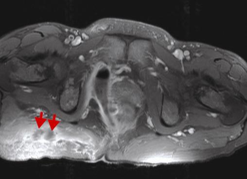 Atteine périnéale sévère avec trajets fistuleux multiples (flèches rouges) au niveau fessier. IRM en séquence T1 avec injection de gadolinium et saturation de graisses.