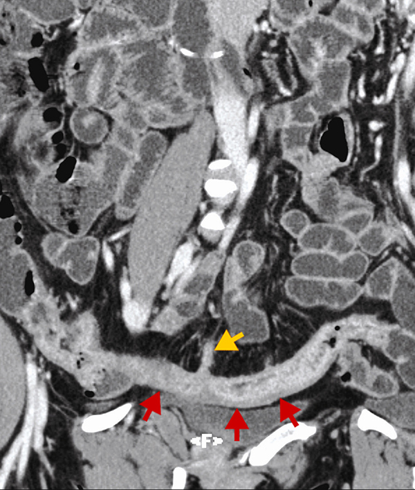 Entéroscanner avec ingestion de mannitol et injection de produit de constrate iodé. Reconstruction curviligne montrant une atteinte inflammatoire de la dernière anse (flèches rouges) avec fistule (flèche jaune) sur le bord mésentérique de l'anse.