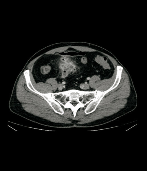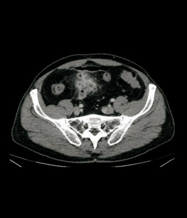 Aspect de collection hydro-aérique au contact de l’iléon correspondant à un abcès, avec hyperhémie du méso (signe du peigne).