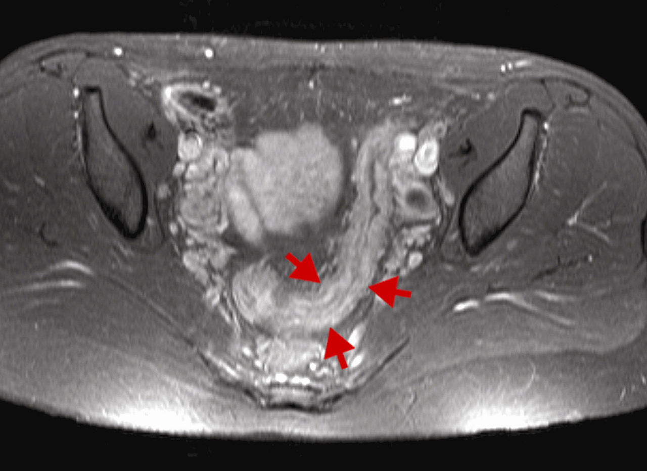 IRM en séquence pondérée T1 avec injection de gadolinium et saturation de graisses revelant un épaississement inflammatoire du sigmoïde (flèches rouges).