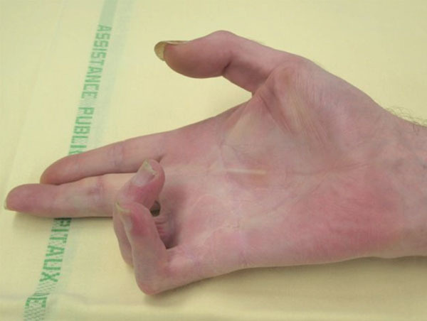 © Emmanuel Masmejean, Daniel Tordjman (La Revue du Praticien) Récidive de formes digitales pures des 4e et 5e rayons, groupe II et stade 2. Voir : Masmejean E, Tordjman D. Maladie de Dupuytren. Rev Prat 2013;63:1263-7.