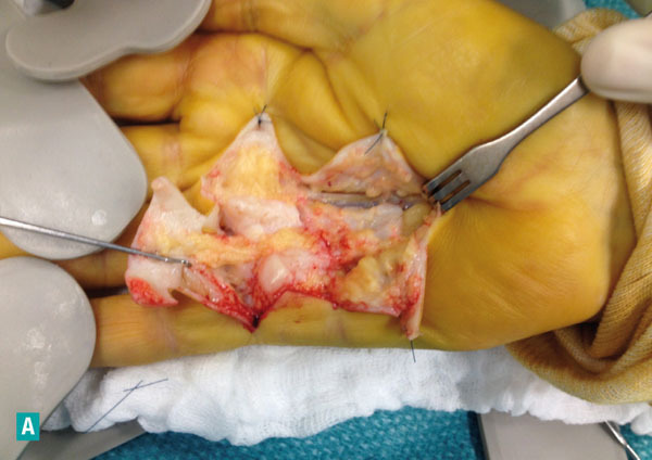 © Emmanuel Masmejean, Daniel Tordjman (La Revue du Praticien) Aponévrectomie chirurgicale. Exposition des nodules et de la fibrose par incision. Voir : Masmejean E, Tordjman D. Maladie de Dupuytren. Rev Prat 2013;63:1263-7.