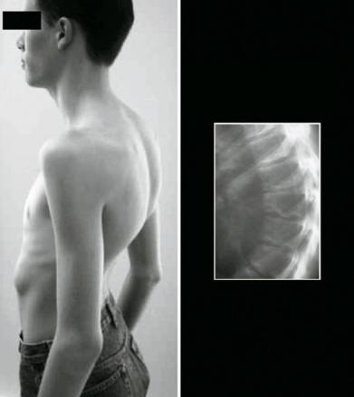 La dystrophie rachidienne de croissance (DRC) ou maladie de Scheuermann est responsable d’une hypercyphose le plus souvent thoracique comme sur la photo de gauche. La radiographie confirme la dystrophie rachidienne en montrant des remaniements des plateaux vertébraux visibles sur la radiographie du rachis de profil ici présentée à droite.