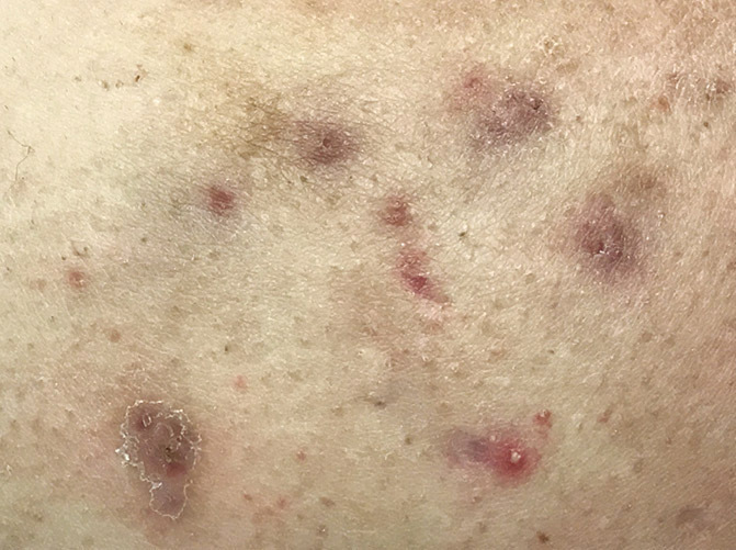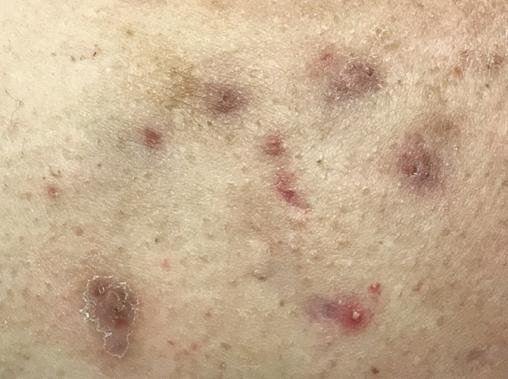 Lésions fessières nodulaires inflammatoires chroniques responsables de poussées suppurantes mensuelles Hurley I