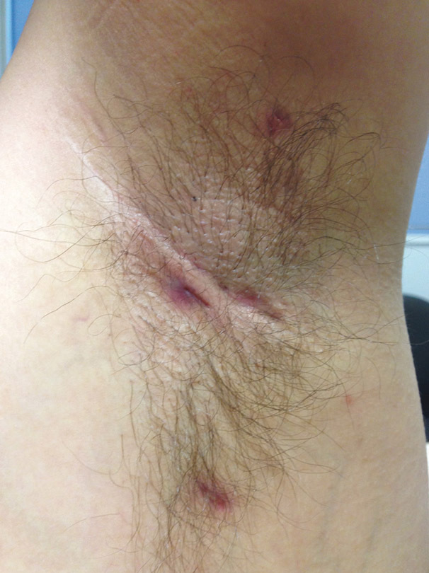 Lésions axillaires et cicatrice fibreuse caractéristique Hurley II