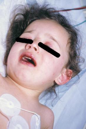 Conjonctivite, chéilite fissulaire et hémorragique, éruption du visage, aspect grognon.