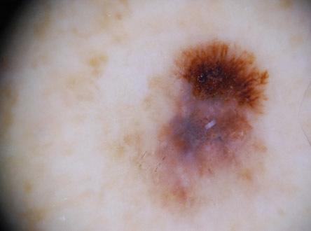 Au dermoscope : lésion mélanocytaire asymétrique, réseau brun irrégulier avec extensions linéaires, points noirs irrégulièrement répartis, aire sans structure beige et grise, globules beiges irrégulièrement répartis.