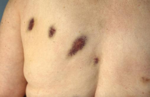 Il s'agit de métastases cutanées d'un mélanome.Cette photo provient de la collection du Pr Olivier Fain (CHU Jean Verdier, Bondy).