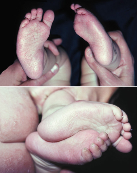 En bas, reproduction de la posture fœtale responsable du métatarsus varus.
