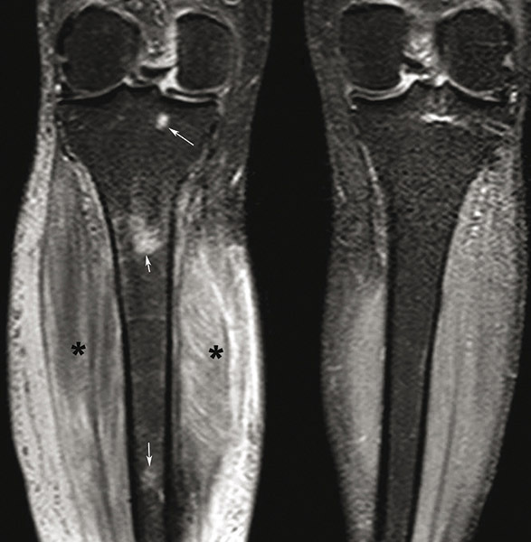 © Sylvain Poirée - La Revue du Praticien Imagerie par résonance magnétique, coupe coronale centrée sur les jambes en pondération T2, STIR montrant des hypersignaux de l'os médullaire du tibia droit (flèches) et des parties molles (*).