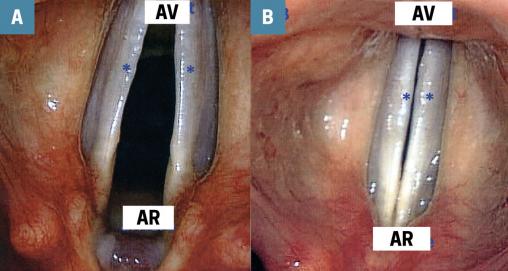 Larynx en position de respiration (A) et de phonation (B). AV : avant ; AR : arrière ; * : corde vocale.