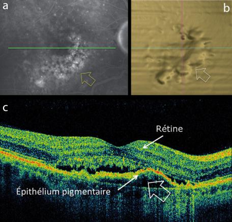 (a) Angiographie à la fluorescéine montrant une hyperfluorescence diffuse dans la macula.(b) La cartographie en tomographie en cohérence optique (OCT) montre que cette hyperfluorescence correspond à un soulèvement irrégulier de l’épithélium pigmentaire.(c) La coupe OCT horizontale (ligne verte cliché a) montre le soulèvement de l’épithélium pigmentaire par les néovaisseaux choroïdiens (flèche large).