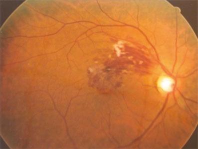 Occlusion de la branche veineuse rétinienne (territoire temporal supérieur) avec hémorragies et nodules cotonneux.