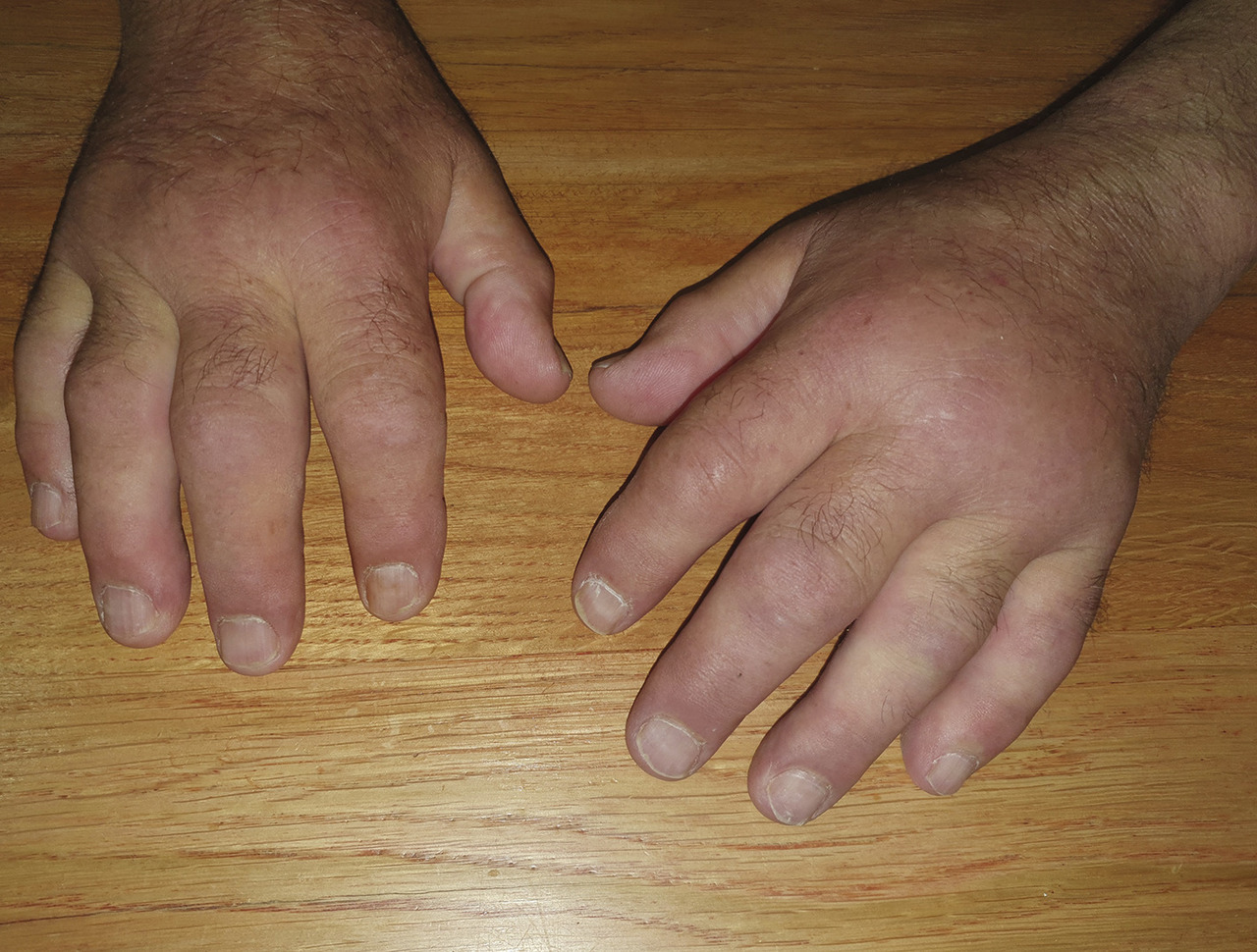 Le syndrome RS3PE (remitting seronegative symmetrical synovitis with pitting edema) est une forme d’acropolyarthrite œdémateuse touchant majoritairement les hommes, à un âge moyen de 71 ans. Cliniquement, les mains sont atteintes dans près de 95% des cas, et l’œdème (symétrique, distal, mou, gardant le godet et n’ayant pas de caractère inflammatoire) survient de manière brutale. L’œdème peut aussi concerner les pieds (50 %) et les poignets (20 %).