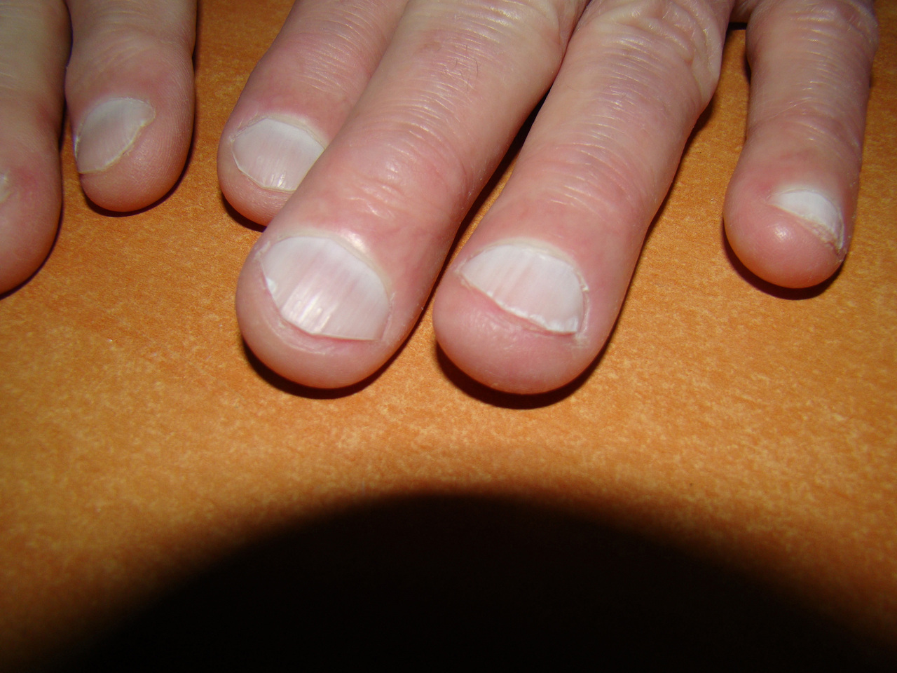 Collection Pierre Francès - La Revue du Praticien Il s’agit d’une leuconychie le plus souvent totale et bilatérale entraînant une absence de visibilité de la lunule. Elle est délimitée par une bande rose foncé, située juste en partie proximale du bord libre de la tablette unguéale.