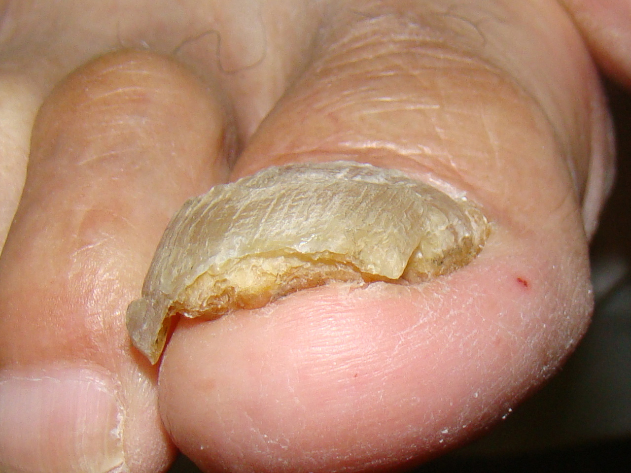 Ongle très friable avec une hyperkératose de la tablette unguéale qui est épaissie (pachyonychie).