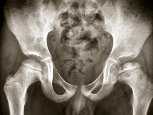 Ostéochondrite de hanche gauche à un stade plus avancé de fragmentation. L'os nécrosé commence à se résorber pour faire apparaître des îlots cartilagineux (en noir) au sein de l'épiphyse fémorale atteinte.