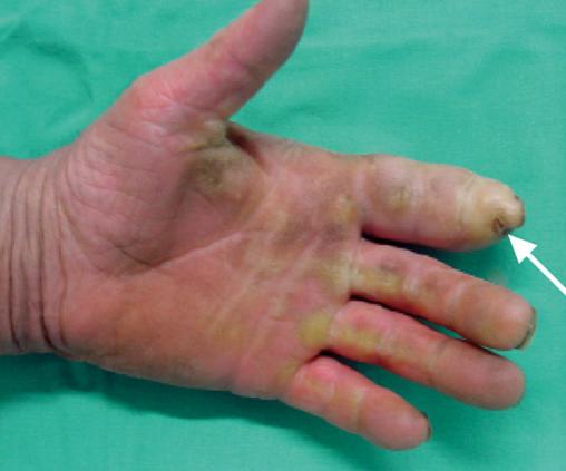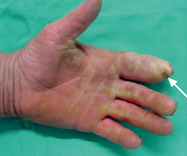 Aspect de panaris évolué avec atteinte extensive des téguments et nécrose pulpaire (flèche). Tiré de : Bouiller K, Menu G, Menez C, Chirouze C. Infection aiguë des parties molles. Rev Prat 2018;68(3):e181-8.