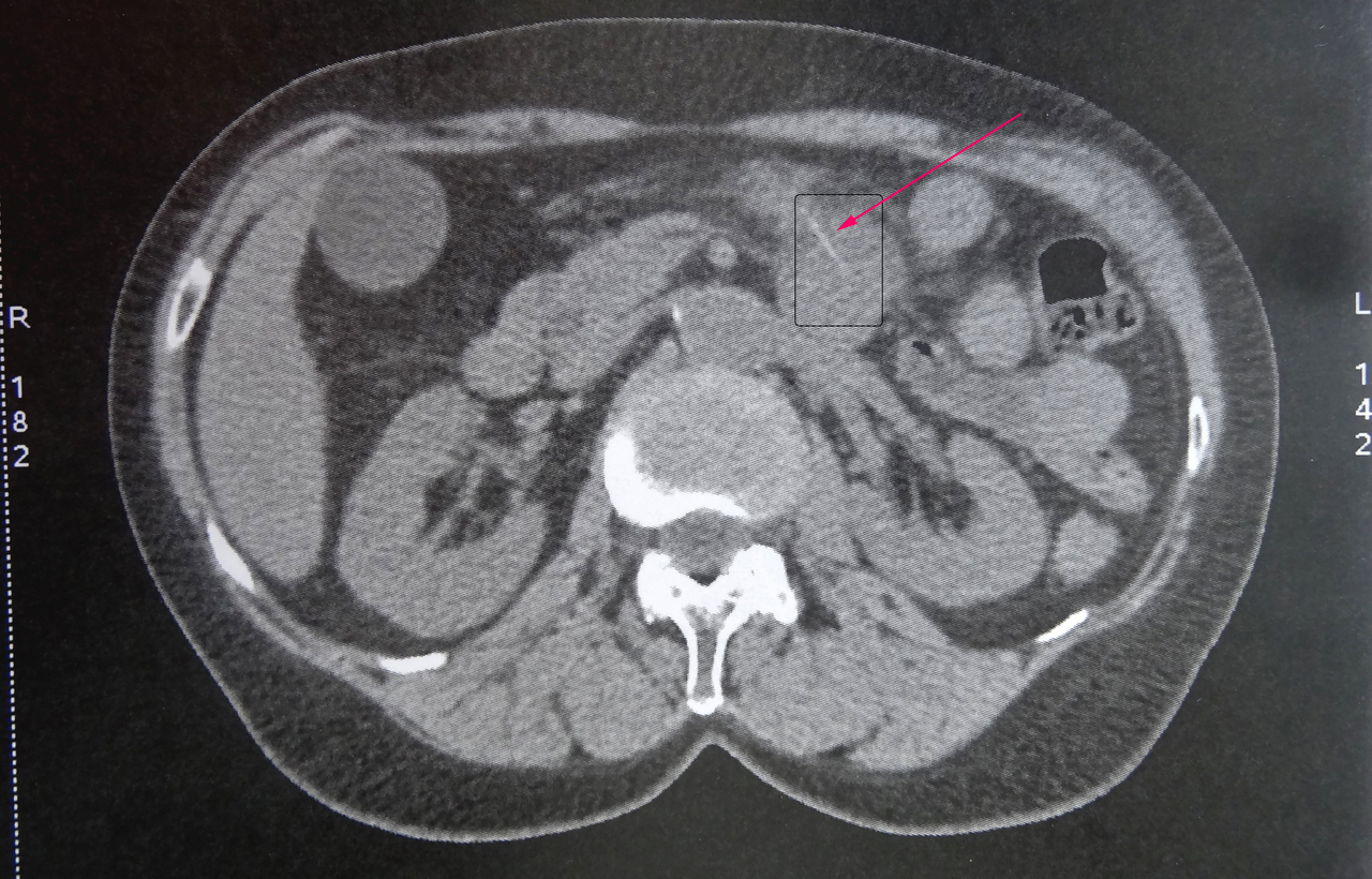 Collection P. Frances Scanner abdominal montrant une arête de poisson fichée au niveau du jéjunum (flèche rouge), à l’origine d’un début de perforation de l'intestin grêle